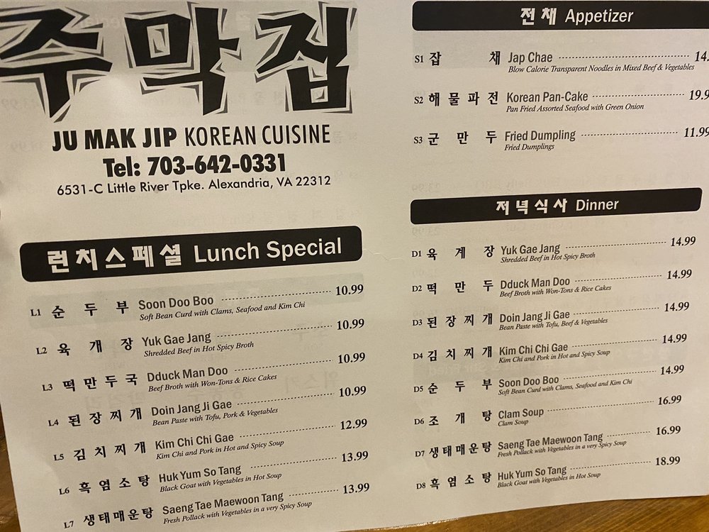 Nestled in Alexandria, VA, Ju Mak Jib offers a cozy, family-run dining experience focused on authentic Korean cuisine. With a welcoming atmosphere and friendly service, this hidden gem caters to Korean food enthusiasts seeking a taste of home-cooked dishes. The menu may be somewhat limited, but the quality of the food shines through, especially in their banchan (side dishes) and kimchi. Standout dishes like the samgyeopsal (pork belly) and dwenjang chigae (bean paste soup) impress with their bold flavors and generous portions. While lacking in kid-friendly options, Ju Mak Jib excels in delivering a truly satisfying dining experience. Don't miss the chance to indulge in their specialties like the black goat stew or the spicy goat meat stew, promising a flavorful adventure for your taste buds.